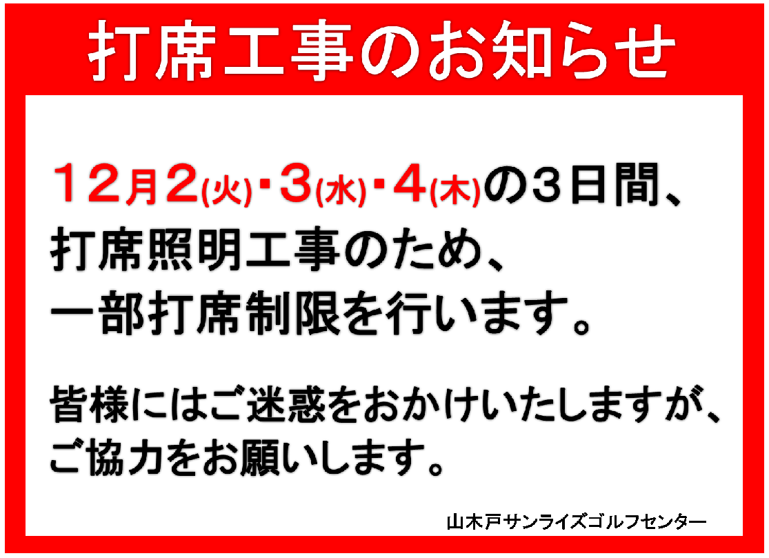 打席工事のお知らせ 2025.11.23 おしらせ 打席工事のお知らせ 12月2㈫・3㈬・4㈭の3日間、打席照明工事のため一部打席制限を行います。 皆様にはご迷惑をお掛けいたしますが、ご協力をお願いいたします。