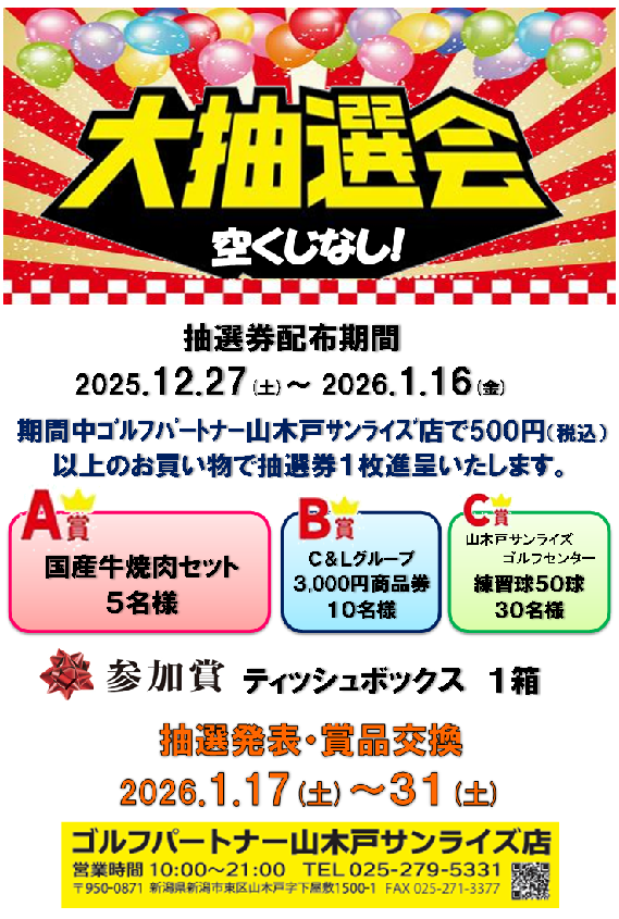 期間中にゴルフパートナー山木戸サンライズ店で500円(税込)以上のお買い物で、抽選券1枚進呈いたします。