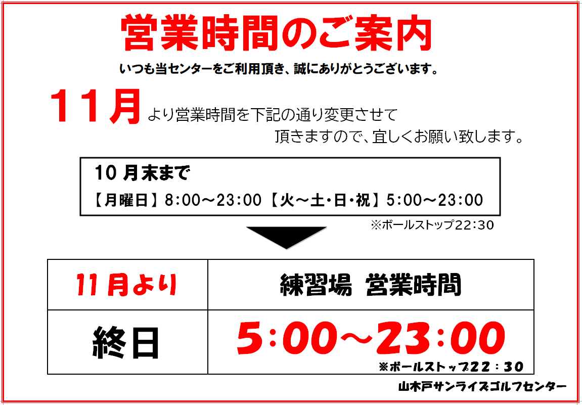 11月からの営業時間のご案内 2025.10.18 おしらせ トピックス 11月からの営業時間のご案内 11月から当練習場の営業時間を下記の通り変更いたします。 終日 5:00~23:00(ボールストップ22:30) よろしくお願いいたします。