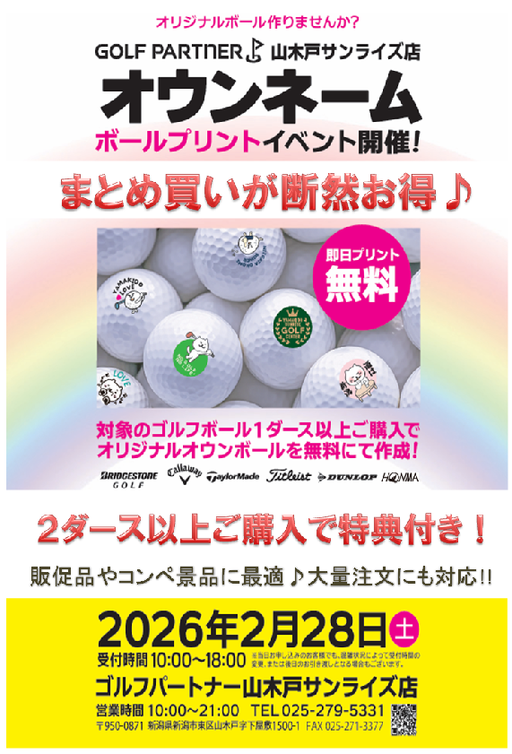 ボールプリントイベント開催 2026.02.21 おしらせ ゴルフパートナー イベント ボールプリントイベント開催のご案内 イベント開催日 2026/2/28㈯ 即日プリント!無料にて作成いたします♪ さらに2ダース以上ご購入で特典付き!! 販促品やコンペ景品に最適です。 ゴルフシーズン開幕の今、まとめ買いが断然お得です!! 皆様のご来店お待ちしております。